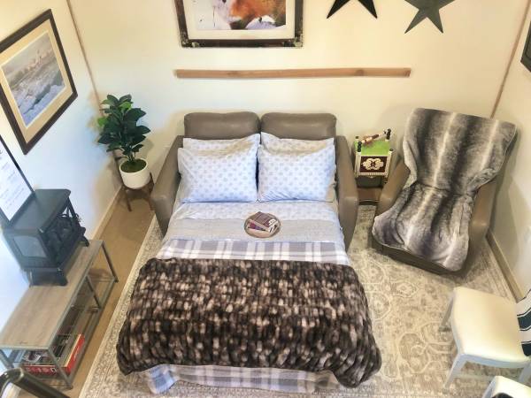 1 double bed in loft, 1 double bed- fold out couch. Full size bath with 5 ft closet. $650 month $60 internet $140 power No pets Month to month. Total $850 month due on the first of every month....