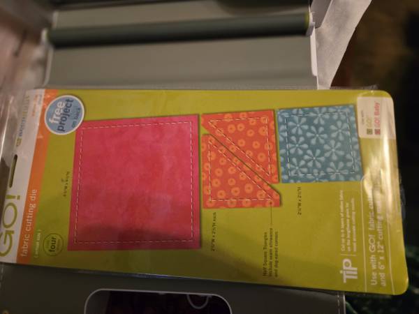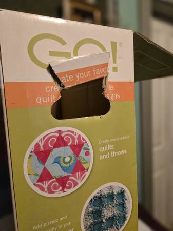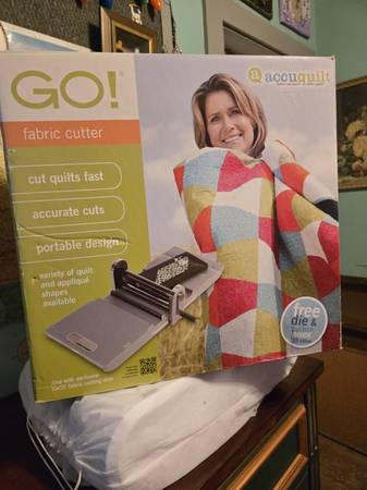 New Accuquilt GO! fabric cutting machine. I only removed it from the box to take pics. I have not used it as it didn't suit my needs and I am not a quilter. Includes picker, 3 templates and storage bag. You can order custom templates for your projects. I tore out the box handles as I moved it around, but the machine is brand new.