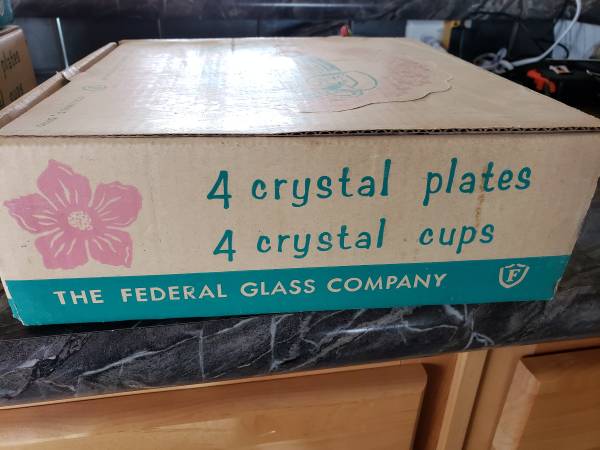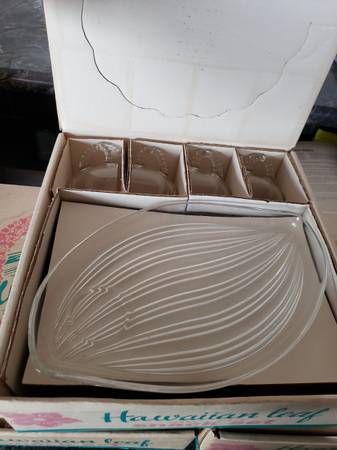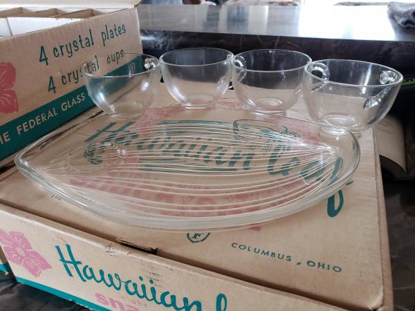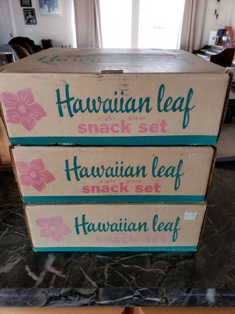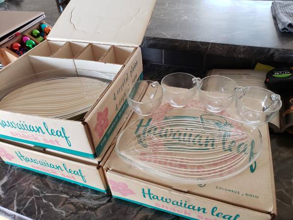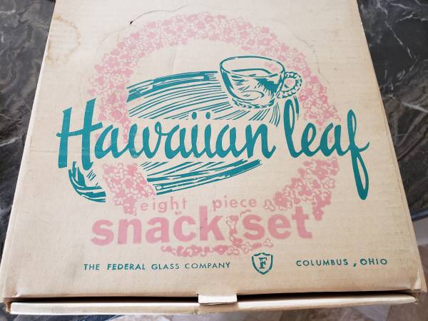 This is a classic set from the 1950’s. This is the Hawaiian Leaf 8 piece snack set. Each full set contains four Plates and four cups. The nice thing is that there is a little ring on the leaf shaped plate to keep your cup in place. Original boxes. This great idea for parties and kids was made and produced by the Federal Glass Company of Columbus Ohio.