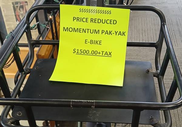 PRE-OWNED: MAGNA MOMENTUM PAKYAK E-BIKE. RETAILED AT $5600.00. BIKE IS IN VERY GOOD CONDITION AND COMES WITH ORIGINAL CHARGER. UNFORTUNATELY, IT WILL NEED A NEW KEY.