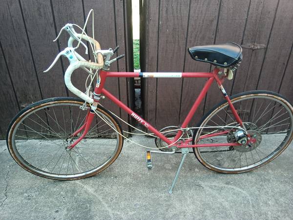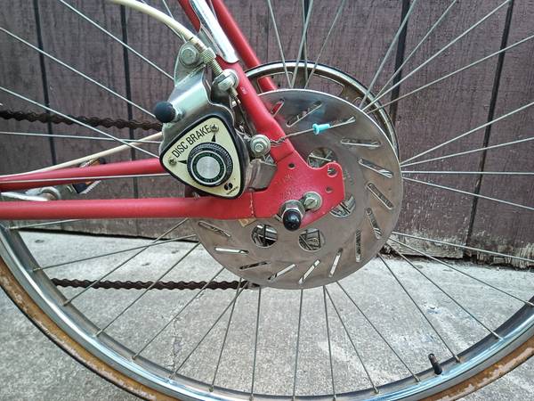 Very rare 1970s Men's Huffy 10-Speed Deluxe Sport with Aluminum Disk Brake! Tournell Shimano brakes with original brake pads(like new), and an original spring saddle. Trans America, all original, even the tires are original, but will need new tires, and needs plastic ties for the brake lines. Stored since the 70s, hardly ridden. I cleaned and adjusted the brakes and oiled throughout. Runs great!! The back disk-brake works excellent, no rust bc all aluminum! The red paint is faded, gear and brake lines need plastic holder straps, but overall rides great for it's age.
