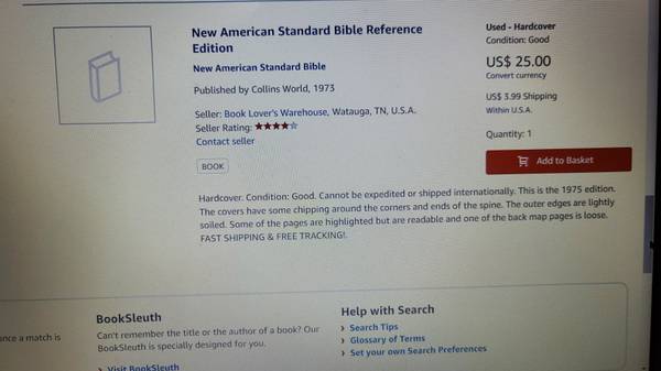 New American Standard Bible Reference Edition 1973.This is a vintage edition book published by Collins World in 1973. The book is in great condition considering its age. It’s a hardcover leather-bound Bible book containing over 400 pages. Asking $25.00.