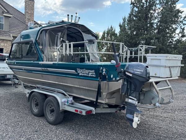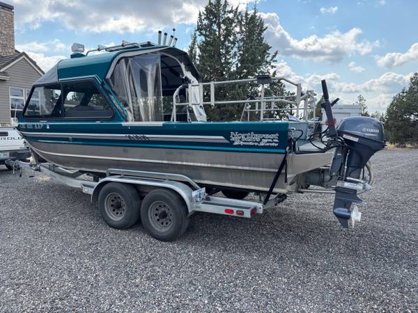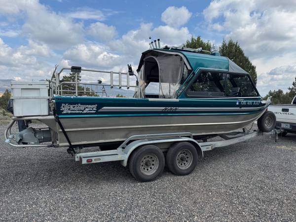 2002 NW jet boat. Signature Series. 3/4 hard top. Wide bottom, wide beam, clear back drop, towing cover, Wallace diesel heater, 212 Hamilton, 496 Chevy (8.1 liter) 375 HP half step rail, removable aluminum fish boxes, stereo, go lights, 100 watt solar panel, onboard charger for 110 power, lowrance HD chart plotter, VHF radio with remote speaker, snap in carpets through out, tilt steering, glove box, upper and lower side trays, bow mount minn kota, Yamaha 9.9 with garmin Tr1 autopilot,Scotty downrigger mounts, rail mount fillet table, 7500 lb tricker trailer with vortex hubs. I ordered this boat new and didn’t think I would ever part with it. I had a driveline installed when I had it built so you can walk all the way around the cover. Sits in my heated shop all year. Never been in the canyon and never hit anything with it. Runs and drives perfect and ready to fish. Boat is located in Powell Butte, Oregon