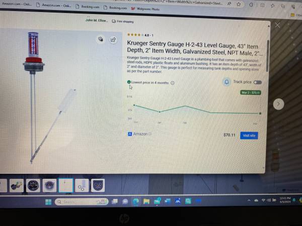 1 bran new Krueger Sentry gauge H-2-45, $40.00 . 45 inch. used in oval heating oil tanks to read inventory at a glance. threads into 2 in. bung on top of tank. These new on line sell for between $ 53.00 and $ 70.00. The first picture is one on line that is for sale new. I also have 2 used ones that work fine for $ 15.00 each. other pictures. Make an offer.