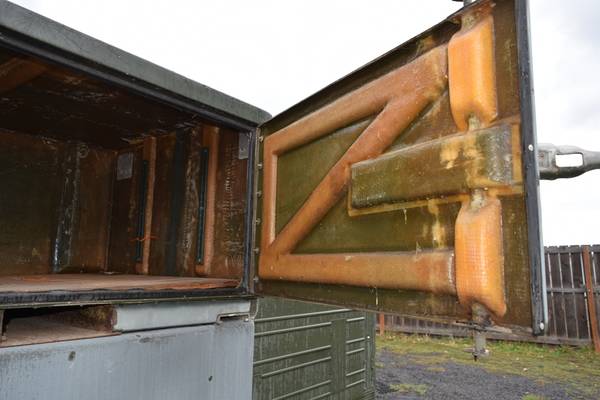 Willard Co. 84" length x 42" width x 30" tall. Max. gross weight 1300 lbs. Tare weight 370lbs. $300.00 per container