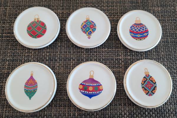Ceramic Holiday Drink Coasters. These coasters are used and in very good condition. They have gold-painted rims around each ornament design. They measure 3-3/4” in diameter and are 3/8” thick. The collection includes a total of 6 coasters. Asking $10.00 Firm.