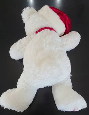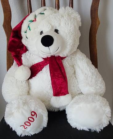 Christmas White Bear 2009: This bear is 24” in length X 22” in width to the end of its arms X 9” thick. It’s trimmed with a Red holiday cap that has a White ball on the end of it. In addition, it has an embroidered design of a poinsettia branch on the front of it. The Red scarf is a printed velour material trimmed on the ends with a White fleece material. The Collector year is 2009. Asking $50.00.