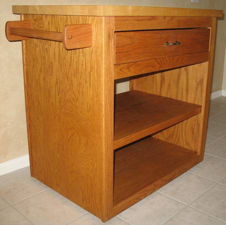 ***LIKE NEW*** A solid Oak multi-use cabinet that comes with 1 adjustable shelve, 1 large 2-way pull-out drawer, and 2 solid Oak towel racks. The cabinet is topped off with a beautiful Solid Maple Butcher Block that is sure to be the envy of your friends who take their cooking seriously. The dimensions are 36"L x 25"W x 37"H. This cabinet was originally $985.00 to custom build for me and now it can be yours for just $500.00. The cabinet has been in storage and now needs a new home. How about yours???