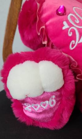 Dark Pink/Magenta Bear-Sweet Hearts 2006: This bear is 21” in length X 12” in width X 10” thick. The bear’s ears and footpads are trimmed in a Pink velour material while his nose and fronts of his footpads are trimmed in a White fleece material. The Pink heart has embroidered letters on it spelling Sweet Hearts along with lace that is both Pink and multi-colored. The heart also has 2 Pink plastic jewels that are sewed onto the pillow as well. The Collector year is 2006. Asking $30.00.