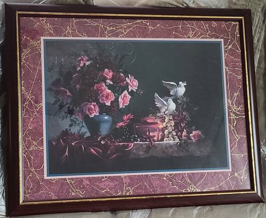 Framed and Matted Picture of Two Doves With Fruit and Roses. The frame dimensions are 31” W x 25” H. Asking $50.00.