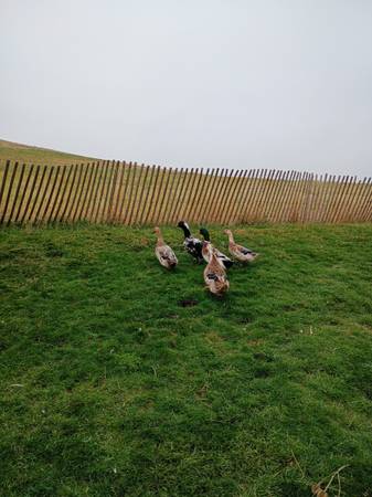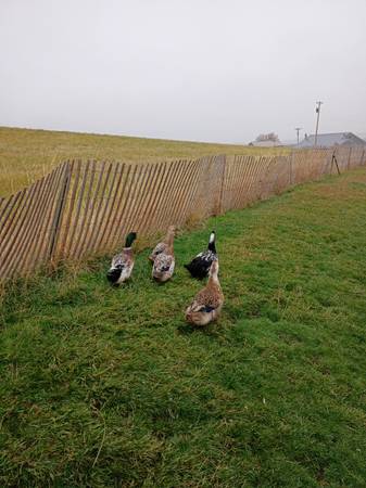 Four adult female ducks, three Silver Appleyard and one Swedish , and one Silver Appleyard drake. All are 20 months old and just finished molting. Will lay again now for 8-10 months with good care. Ducks can produce eggs for 6 or more years, so these are in their prime. Must go as a group. Only selling because the racoons keep getting them Heartbreaking.