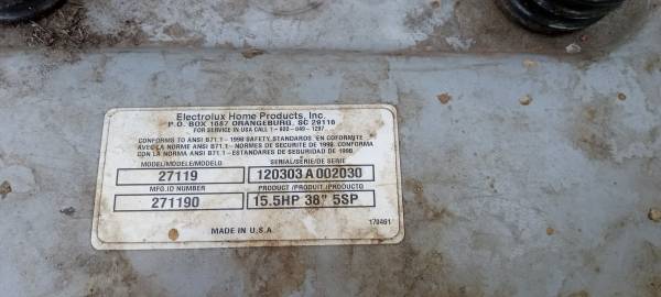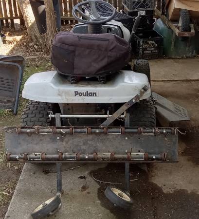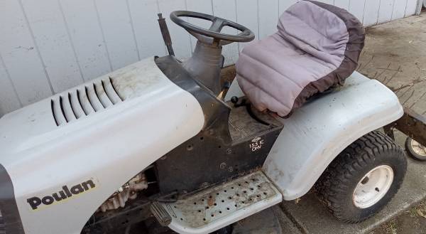 Poulan riding mower. 15.5 HP / 38 INCH with Commercial/Industrial Engine. New battery, spark plug, starter, starter solenoid, oil change, air filters, & carburetor. Has Owner's manuals,thatcher & grass catcher. There is a front tire that loses air. Please text or leave message. Will return ASAP as I am not available during working hours. Will be sold as is.