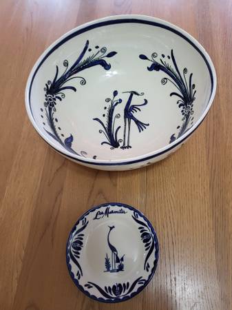 Large deep blue decorative bowl. Shows beautifly standing. From restaurant outside Mexico City. Peacocks freely roamed grounds. Mini accent plate.