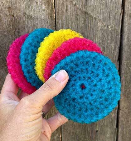 Crocheted 100% Nylon Scrubbies These are doubled up and super durable! Throw them in the dishwasher or the washing machine to clean and sanitize them! They last forever! Grab bag of random colors-6...