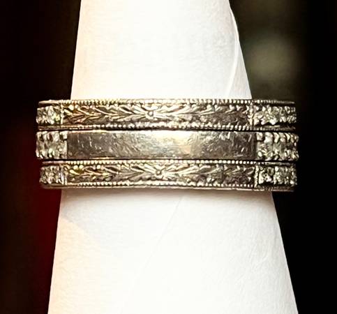 The palladium wedding bands are custom made to fit the engagement ring with 30 round brilliant cut diamonds bead set on each band. The profile of each band has hand carving around the shank with file mill grain beading. There are a total of 60 round brilliant cut diamonds in both wedding bands. The wedding bands weigh 4 grams and diamonds weigh .45ctw.