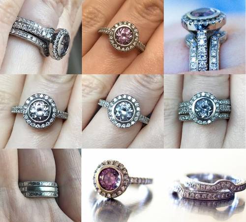 The quality of the accent diamonds in the engagement ring and wedding bands is E-F color, VS clarity.