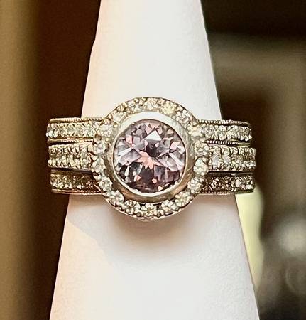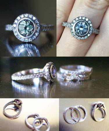 One ladies diamond and palladium custom engagement and wedding set. The engagement is a cathedral style that contains one center unheated, natural color-change sapphire in a bezel setting. The color change is dramatic from green (sunlight) to purple (incandescent), with champagne and blue tones depending on the light source. The sapphire is surrounded by 17 round brilliant cut accent diamonds around the perimeter and 24 accent diamonds down the shoulders prong set. The side profile of the ring has an open trellis with a total of 12 brilliant cut accent diamonds bead set. The diamonds in the engagement ring weigh .69ctw.