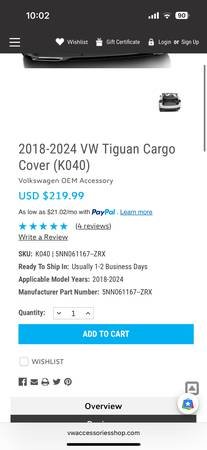 New Volkswagen Tiguan Cargo cover. Came with car when bought new and have never used. Retails for $220 from the website but asking $150. Text or email for questions.