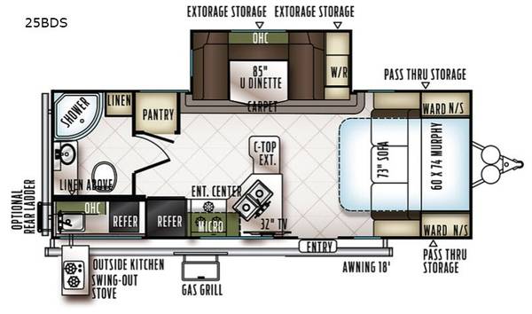 Are you ready to camp at your leisure, if so then this Flagstaff Micro Lite 25BDS is ideal for you! There is sleeping space for four people in this model so you can camp with your kids or even an overnight guest or two. The single slide out helps to open up the floor space. The front features a 73" sofa which is a great spot for seating during the day, and at night easily pull down the 60"x74" Murphy Bed to get a good night's rest. Outside you can enjoy the convenience of the exterior kitchen with a pull out stove, sink, and refrigerator. Plan to sit and visit just a little bit longer under the 18' awning, and more!