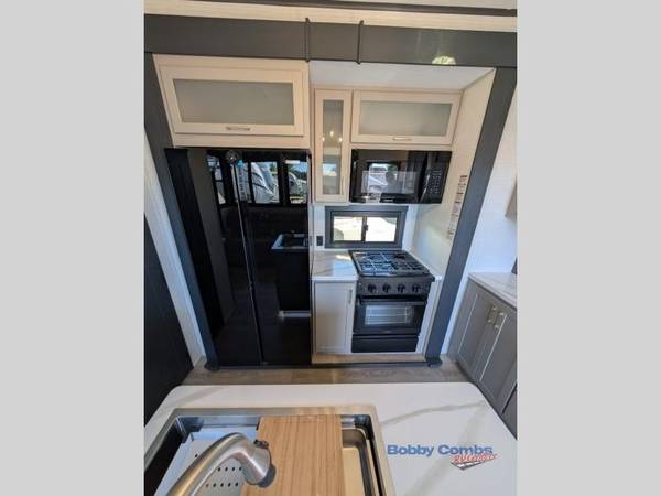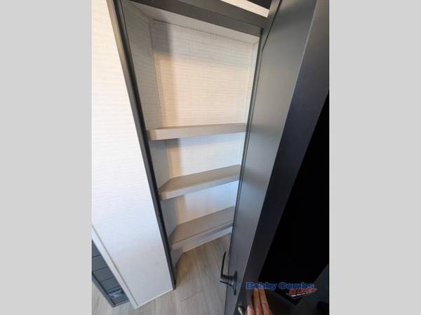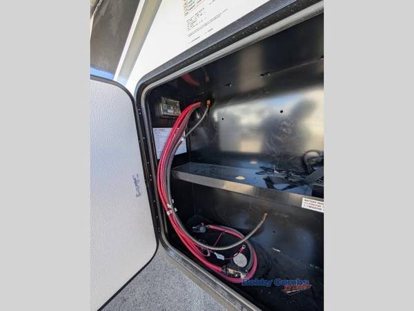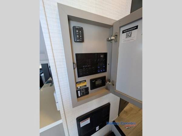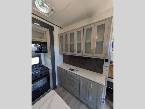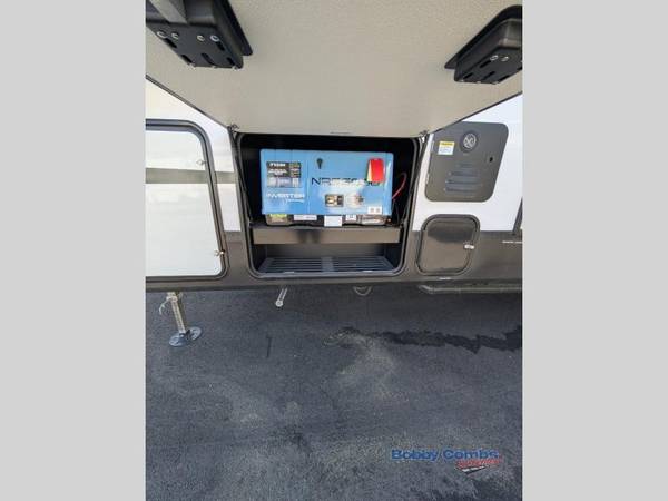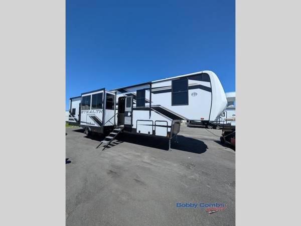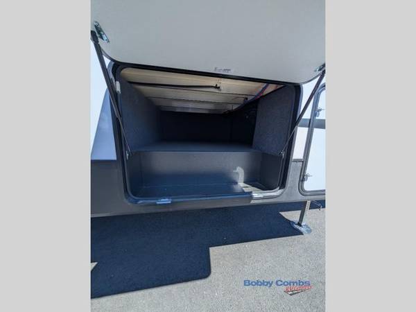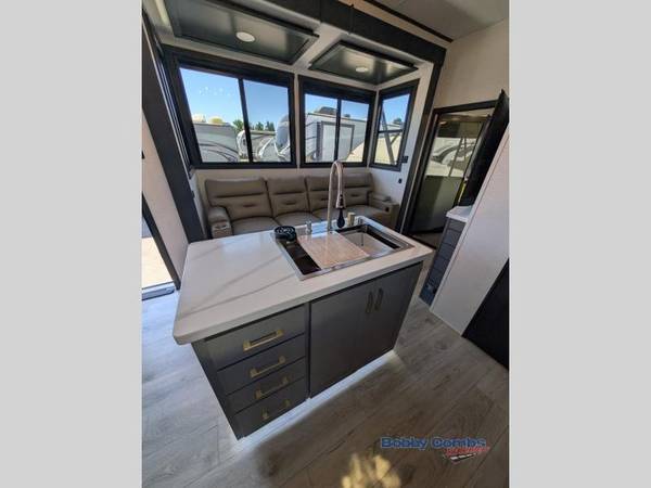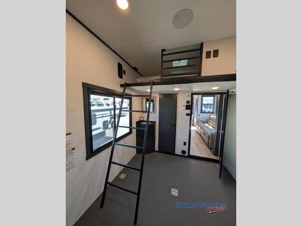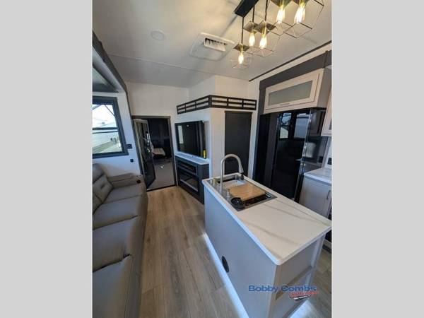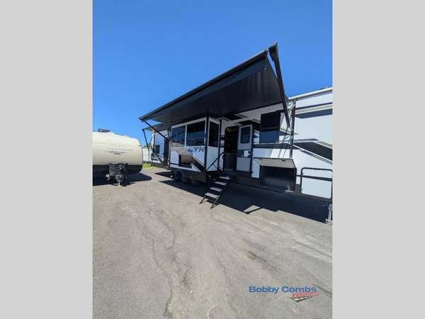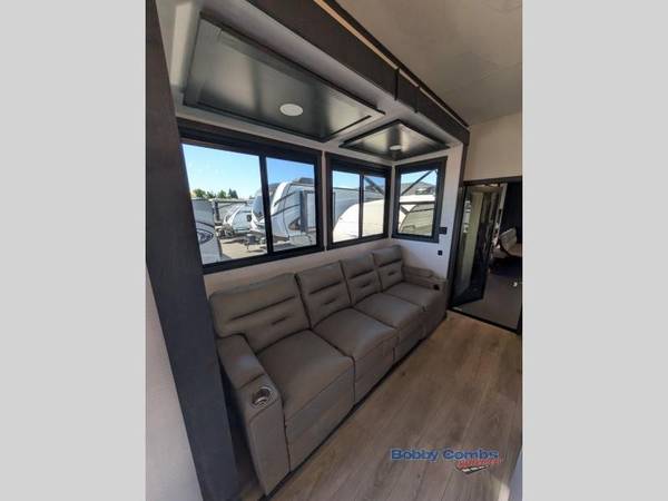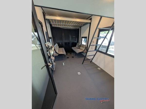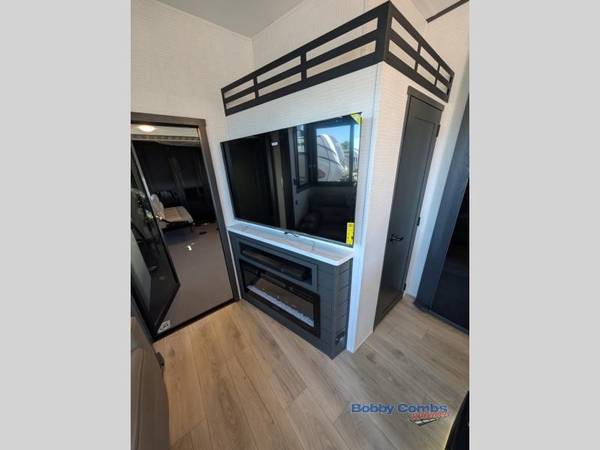 This toy hauler front bedroom is serene and perfect for you and your partner, featuring a king bed, wardrobe, and shelves space for all your favorite belongings. The perfect place to relax and recharge after a long day of adventure. The full bathroom is fitted with everything you need to freshen up and feel at home. Moreover, the kitchen/living room area is equipped with a microwave, refrigerator, waterfall sink, shelves, sofa, overhead cabinet for added storage space, and entertainment center with fireplace, perfect for entertaining friends and family. The 14’ 6" garage boasts a loft, sit and sleep rollovers, a removable dinette table with sleep and store space above, and a second full bathroom. Perfect for hauling your favorite toys, from motorcycles to ATVs, this garage area has everything you need to take your adventures to new heights. Finally, with dual entry/exit doors, you'll have easy access to the garage and the rest of the RV. Plus, with the dual 12' and 20' awning, you'll have plenty of shade and protection no matter the year season.