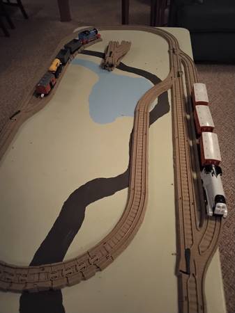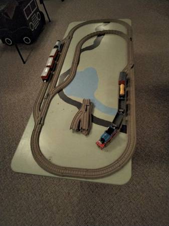Two locomotives, Thomas and Spencer, 3 passenger and 4 freight cars. Lots of track and switches. Battery operated, table not included.