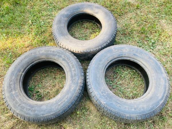2 are Wild Country Radial XRT, the other is a Dayton Timberline A/T. No rips or tears in the bead. Tread is good to ok. Great for spares or trailer tires. All 3 for $40.
